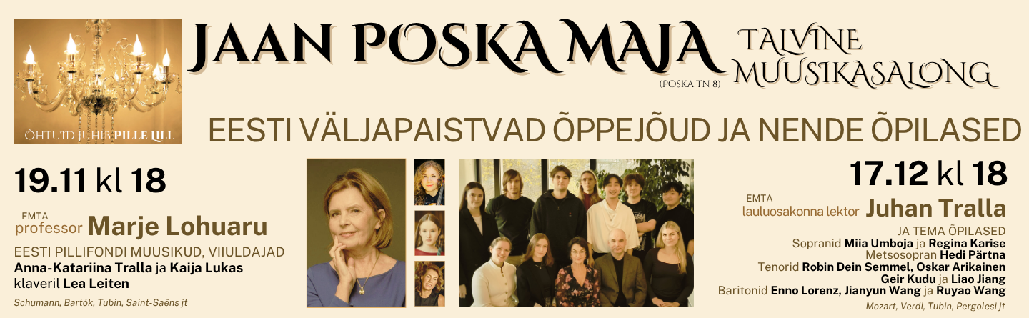 Jaan Poska Maja ja Muusikute fond PLMF esitlevad Jaan Poska Maja Muusikasalong (Poska tn 8) 19.11 kl 18 EESTI VÄLJAPAISTVAD ÕPPEJÕUD JA NENDE ÕPILASED EMTA prof. Marje Lohuaru ja Eesti Pillifondi muusikud Viiuldajad Anna-Katariina Tralla ja Kaija Lukas...