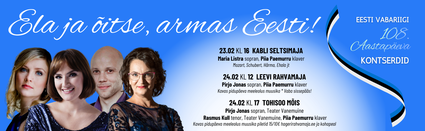 Hageri Rahvamaja ja Muusikute fond PLMF esitlevad Tohisoo Mõis 24.02 kl 17 PIDUPÄEVA KONTSERT Pirjo Jonas (sopran, Teater Vanemuine), Rasmus Kull (tenor, Teater Vanemuine), Piia Paemurru (klaver) Kavas pidupäeva meeleolus...