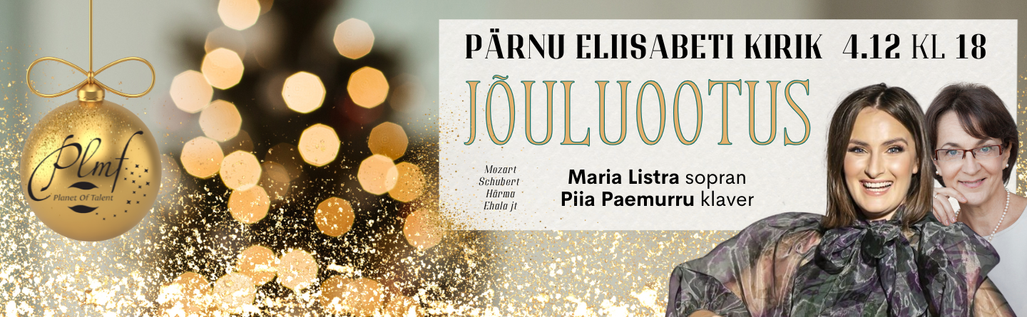 Tartu Jaani kirik 18.11 kell 18 TALVEOOPER 2025 Sopranid Marion Melnik ja Laura-Retti Laos, Ivo Posti (kontratenor), Piia Paemurru (klaver) Kavas: Mozart, Pergolesi, Händel, Lehár jt. Piletid hinnaga 20/12€ on saadaval PILETILEVIS ja kohapeal enne kontserdi algust!