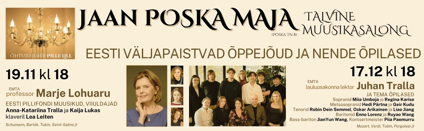 Jaan Poska Maja ja Muusikute fond PLMF esitlevad Jaan Poska Maja Muusikasalong (Poska tn 8) 19.11 kl 18 EESTI VÄLJAPAISTVAD ÕPPEJÕUD JA NENDE ÕPILASED EMTA prof. Marje Lohuaru ja Eesti Pillifondi muusikud Viiuldajad Anna-Katariina Tralla ja Kaija Lukas...