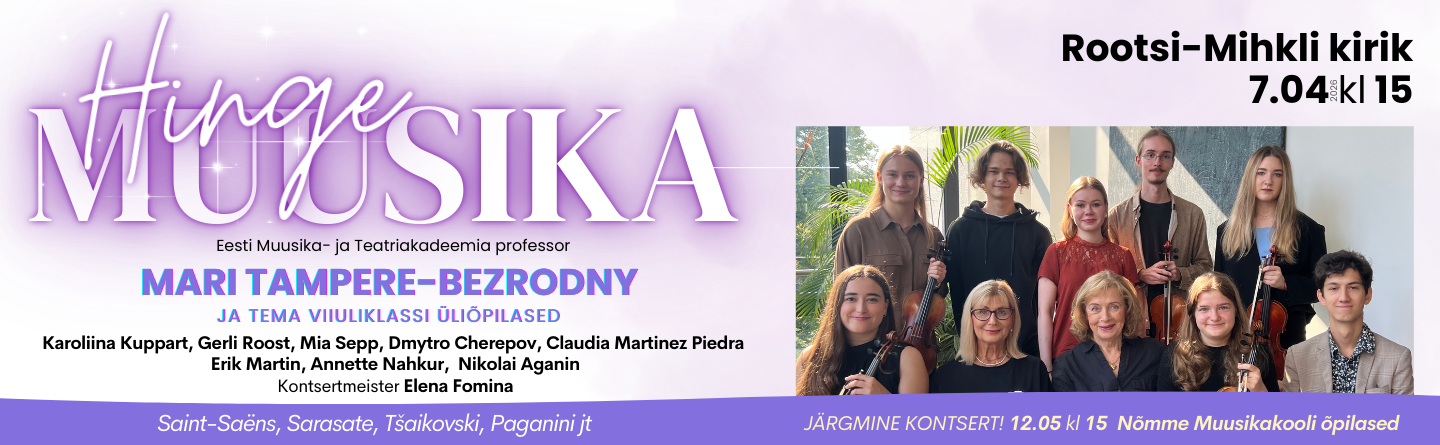 EELK Rootsi-Mihkli kogudus ja Muusikute fond PLMF esitlevad Rootsi-Mihkli kirik 10.03.2026 kl 15 HINGEMUUSIKA Tallinna Muusika- ja Balletikooli MUBA õpetaja sopran Kristina Vähi koos õpilastega Sofia Hussainova, Paula Põhjakivi, Randal... |