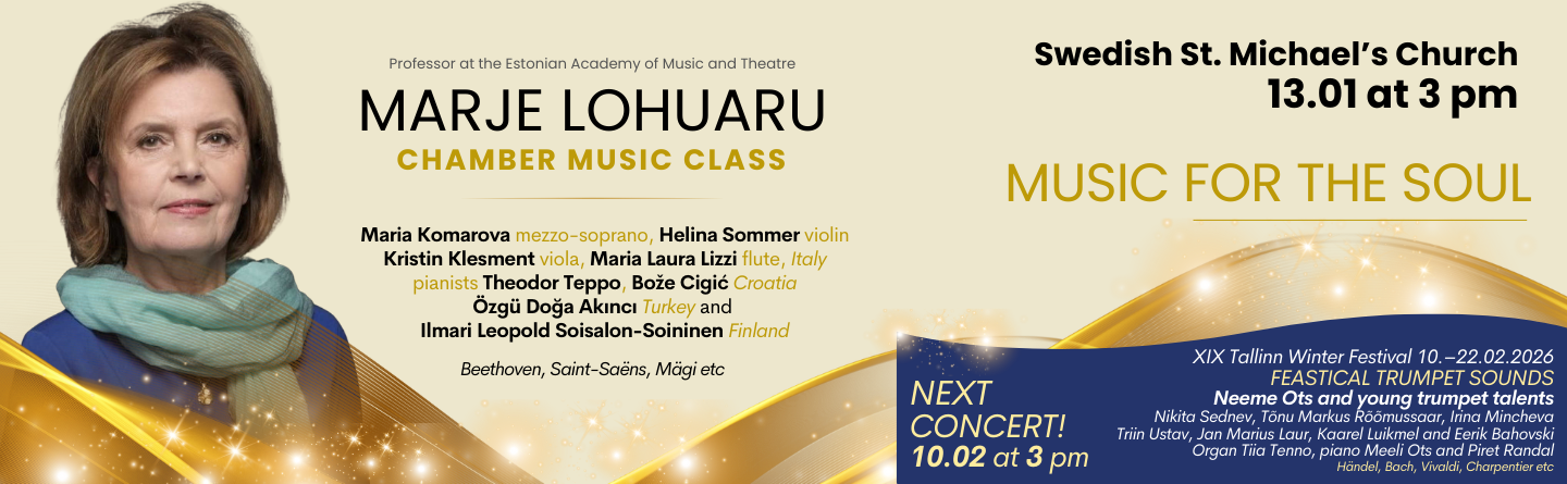 Pärnu City Government, EELC Pärnu Elizabeth’s Congregation and Music Trust PLMF presentSt. Elizabeth's Church in Pärnu4th of December at 6 PMWAITING FOR CHRISTMASMaria Listra (soprano), Piia Paemurru (piano)Program: Mozart, Schubert,...