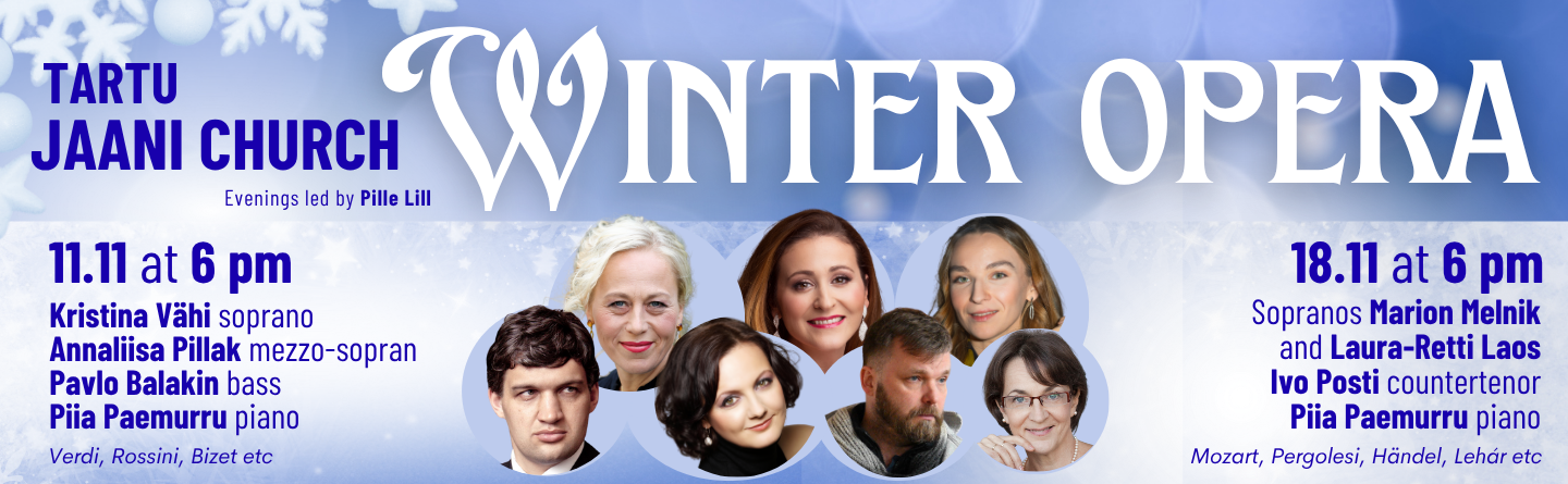 Tartu St. John’s ChurchNovember 18 at 6 PMWinter Opera 2025Sopranos Marion Melnik and Laura-Retti Laos,Ivo Posti (countertenor), Piia Paemurru (piano)Program: Mozart, Pergolesi, Händel, Lehár, etc.Tickets priced at €20/€12 are available...