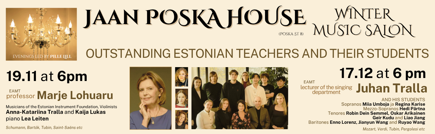 Jaan Poska House and Music Trust PLMF present Jaan Poska House Music Salon (Poska St. 8) 19.11 at 6 PM ESTONIA’S DISTINGUISHED TEACHERS AND THEIR STUDENTS EMTA Prof. Marje Lohuaru...