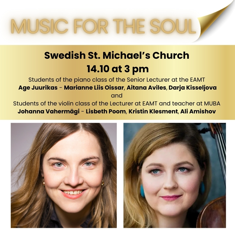 Swedish St. Michael's Church Rüütli 9, Tallinn, EestiThe Swedish St. Michael’s Congregation of the Estonian Evangelical Lutheran Church and Music Trust PLMF presentSwedish St. Michael’s ChurchOctober 14 at 3 PM MUSIC FOR THE SOUL Students from the piano class of Age Juurikas (Senior Lecturer, Estonian Academy of Music and Theatre) and the violin class of Johanna Vahermägi (Lecturer at EAMT and teacher...