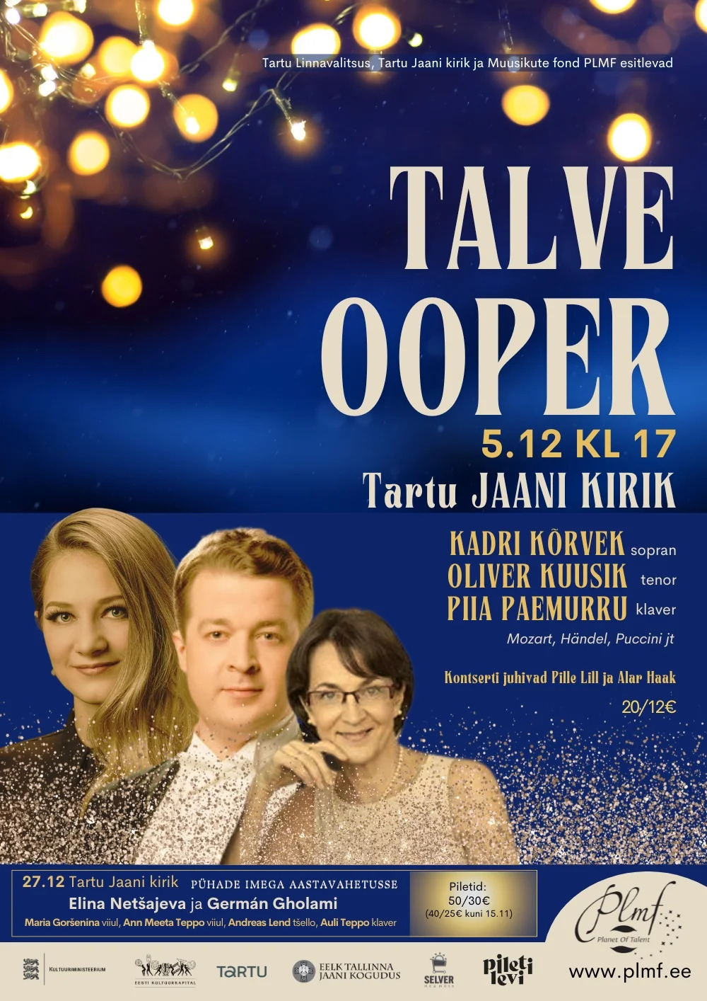 Muusikute fond PLMF korraldab Talveooperi kontsert-etendusi Tartu Jaani kirikus väljapaistvate ooperisolistidega. Õhtut juhivad Alar Haak ja Pille Lill.