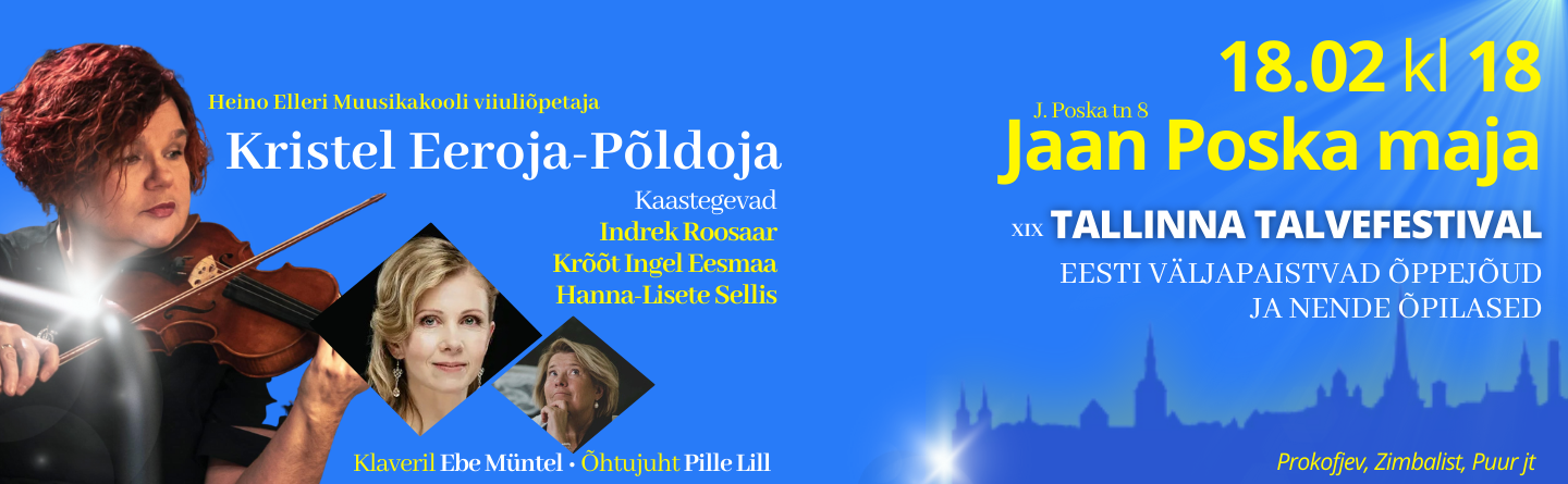 Jaan Poska maja 18.02 kl 18 EESTI VÄLJAPAISTVAD ÕPPEJÕUD JA NENDE ÕPILASED Heino Elleri muusikakooli õpetaja Kristel Eeroja-Põldoja (viiul) ja tema õpilased Indrek Roosaar, Krõõt Ingel Eesmaa, Hanna-Lisete Sellis Klaveril Ebe Müntel Prokofjev, Zimbalist,...