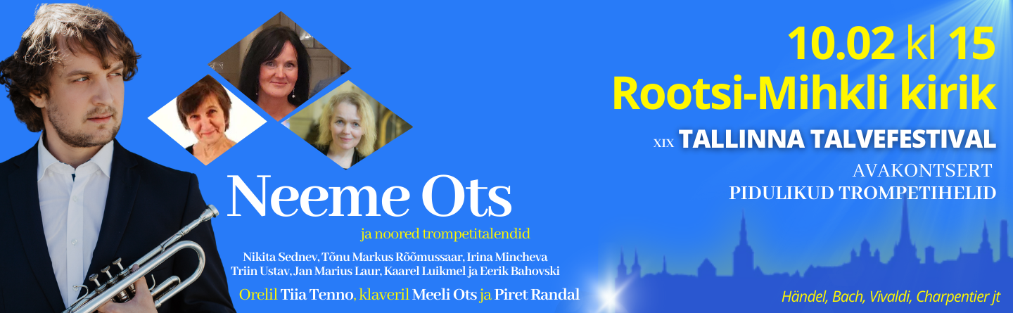 Rootsi-Mihkli kirik 10.02 kl 15 PIDULIKUD TROMPETIHELID Neeme Ots ja noored trompetitalendid Nikita Sednev, Tõnu Markus Rõõmussaar, Irina Mincheva, Triin Ustav, Jan Marius Laur, Kaarel Luikmel ja Eerik Bahovski Orelil... |