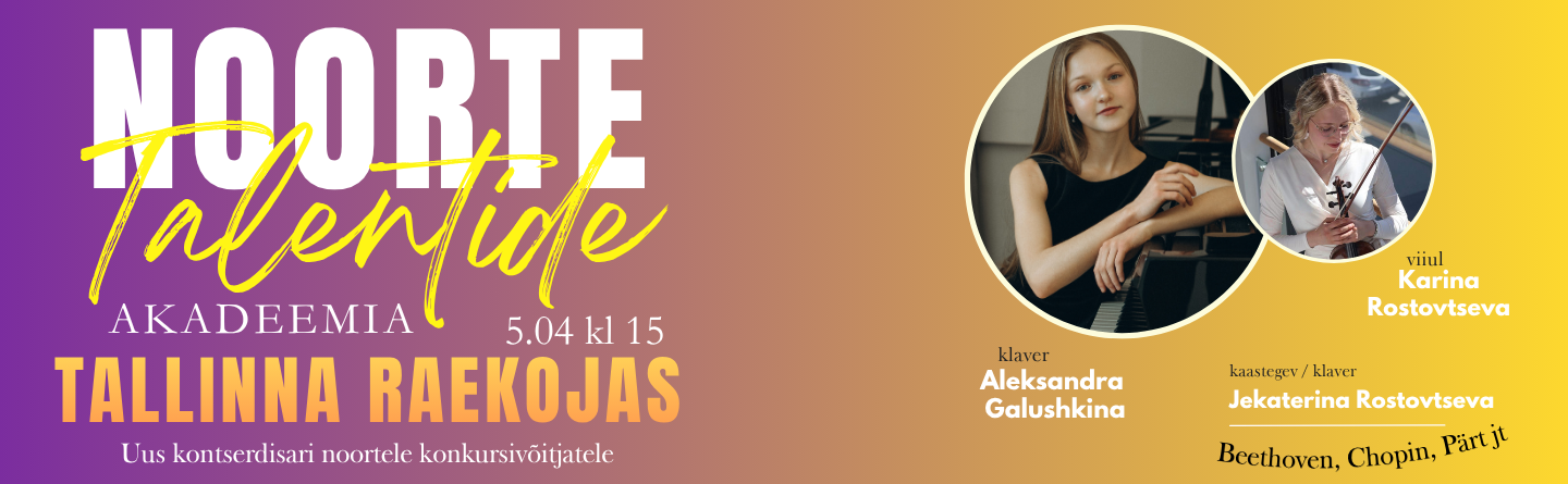 Muusikute fond PLMF esitleb Tallinna Raekoda 5.04.2026 kl 15 NOORTE TALENTIDE AKADEEMIA Aleksandra Galushkina (klaver), Karina Rostovtseva (viiul) Kaastegev Jekaterina Rostovtseva (klaver) Beethoven, Chopin, Pärt jt. Piletid hinnaga 10/5€ saadaval...