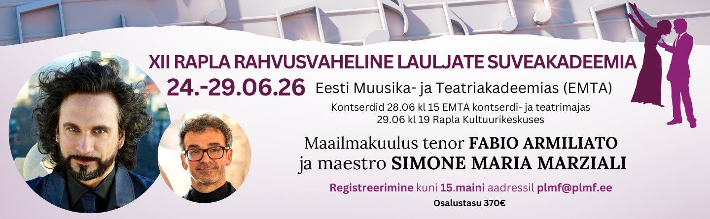 Muusikute fond PLMF esitleb Tallinna Raekoda 5.04.2026 kl 15 NOORTE TALENTIDE AKADEEMIA Aleksandra Galushkina (klaver), Karina Rostovtseva (viiul) Kaastegev Jekaterina Rostovtseva (klaver) Beethoven, Chopin, Pärt jt. Piletid saadaval Piletilevis ja...